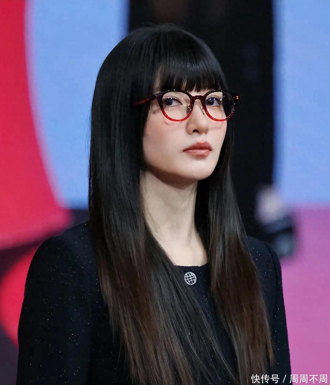 齐刘海把额头盖得严严实实,瞬间让脸显得又短又圆;配上又大又夸张的红框眼镜,再叠加厚重的大浓妆,硬生生把性感风拉回90年代土味写真水平。西装裙的成熟、齐刘海的学生感、微醺腮红的暧昧,三者混搭得莫名其妙,网友调侃“像喝醉了的严厉老师”,还有人直言“换了个刘海,差点没认出这是江疏影”。